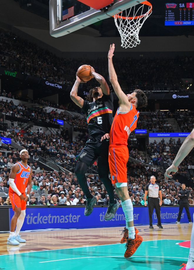 兩隊(duì)拼防守拼的很厲害,文班亞馬在場(chǎng)上都沒(méi)有太多的機(jī)會(huì),上半場(chǎng)文班亞馬只拿到7分,SGA在第二節(jié)是大爆發(fā)8中5拿到11分1籃板2助攻,半場(chǎng)打完SGA拿到16分,馬刺這邊則是多點(diǎn)開(kāi)花,卡斯?fàn)?、瓦塞爾、巴恩斯、凱爾登發(fā)揮都比文班亞馬還好。