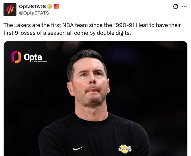 糟糕的防守表現(xiàn)讓湖人隊往往是“贏得艱難,輸?shù)盟臁?,本場再度慘敗后,湖人隊成為NBA近35年首支前9場失利均輸?shù)魞晌粩?shù)的球隊。