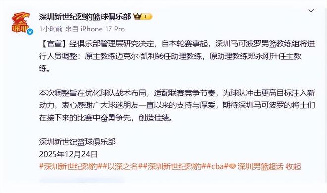 消息內(nèi)容是:“經(jīng)俱樂部管理層研究決定,自本輪賽事起,深圳馬可波羅男籃教練組將進(jìn)行人員調(diào)整:原主教練邁克爾-凱利轉(zhuǎn)任助理教練,原助理教練鄭永剛升任主教練。”