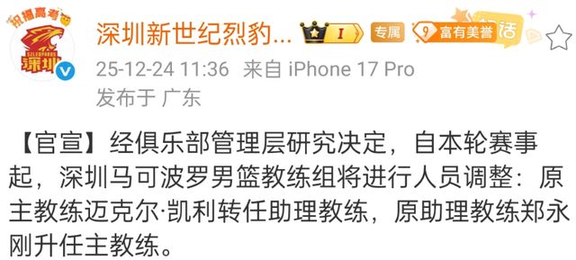 然而讓人意想不到的是,本賽季第二位下個(gè)主帥是深圳男籃的外教凱利。根據(jù)深圳男籃官方公告,凱利確定下課,遼寧名宿鄭永剛走馬上任。有趣的是,這已經(jīng)是鄭永剛連續(xù)兩個(gè)賽季在賽季中途接手,上賽季他接替的是周鵬。