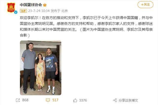 此前據(jù)體壇周報報道,2023年7月24日,中國籃協(xié)曬出一張姚明、李凱爾以及李凱爾母親的合影,宣布這位歸化球員正式獲得中國國籍。今夏,李凱爾將身披中國男籃戰(zhàn)袍出現(xiàn)在男籃世界杯的舞臺上,幫助中國隊沖擊巴黎奧運會門票。
