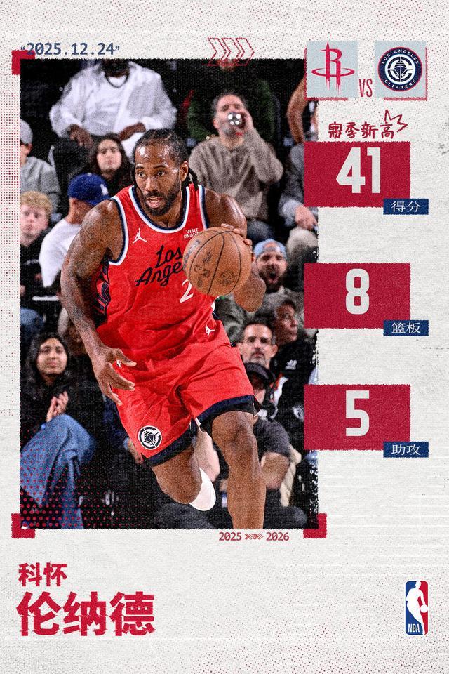 北京時間12月24日,洛杉磯快船在主場以128-98大勝休斯頓火箭收獲兩連勝,科懷-倫納德此役23中16高效貢獻41分8籃板5助攻,得分創(chuàng)造個人賽季新高。