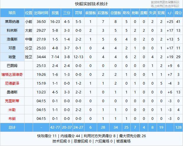 萊昂納德41分8板5助、哈登29分4板6助2斷、科林斯13分5板5助2斷2帽、桑德斯13分1板1助、鄧恩11分4板2助、巴圖姆6分、洛佩斯5分6板4助2帽、米勒4分1板