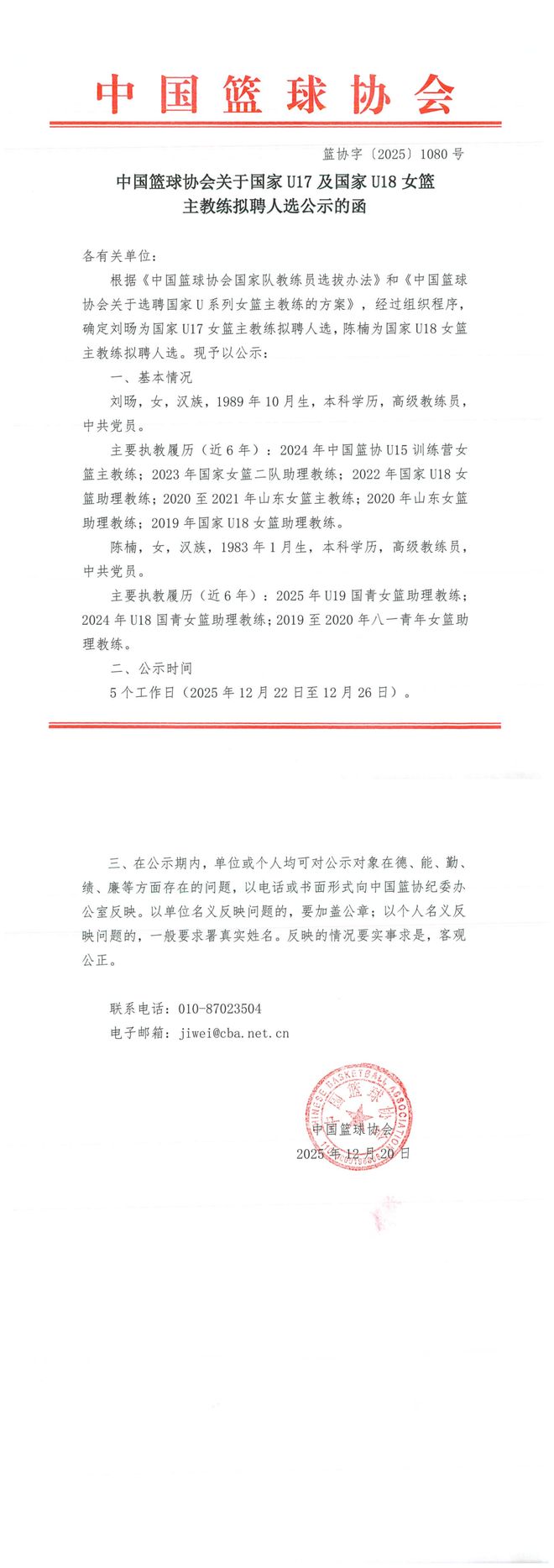 中國(guó)籃協(xié)公示國(guó)青主教練擬聘人選