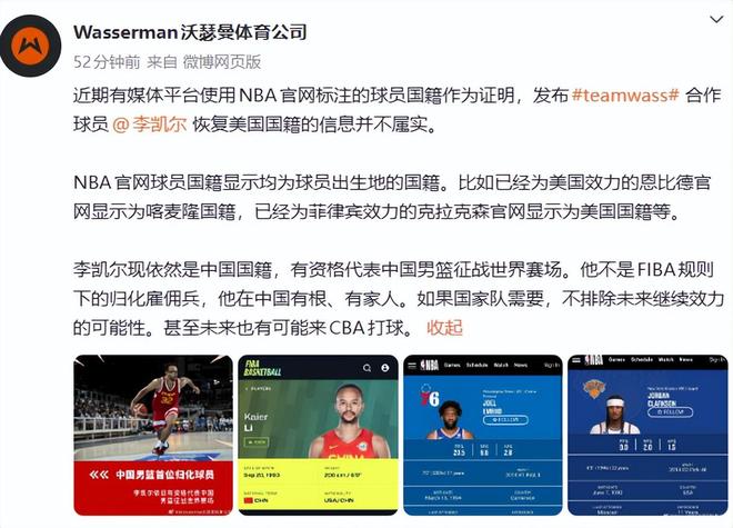 針對NBA官網(wǎng)顯示李凱爾的國籍已經(jīng)更改為美國籍一事,其經(jīng)紀公司發(fā)文辟謠,稱該信息不屬實,李凱爾現(xiàn)依然是中國國籍。