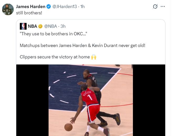 NBA官方曬出哈登VS杜蘭特的瞬間寫道這兩人曾經(jīng)是兄弟,哈登立馬轉(zhuǎn)推回復(fù):我們現(xiàn)在也是兄弟。