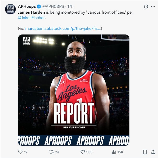 兩天之前,快船媒體APHoops就建議火箭交易得到哈登,因?yàn)檫@支火箭隊就缺少一個組織后衛(wèi),快船媒體還為火箭模擬了一套6換4的方案,從這個角度來看此役算是哈登的驗(yàn)貨之戰(zhàn)吧。