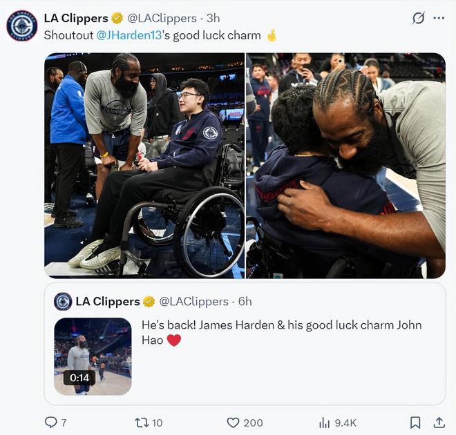 賽后快船官方曬出了哈登再一次擁抱約翰-郝的推文,哈登真的是一個非常暖心的人。