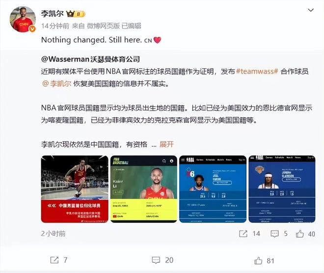 李凱爾經(jīng)紀(jì)公司W(wǎng)asserman在第一時(shí)間進(jìn)行了聲明,這家公司表示李凱爾恢復(fù)美國(guó)國(guó)籍的信息并不屬實(shí),他現(xiàn)在依然是中國(guó)國(guó)籍,有資格代表中國(guó)男籃征戰(zhàn)世界賽場(chǎng)。李凱爾經(jīng)紀(jì)公司還指出李凱爾不是FIBA規(guī)則下的歸化雇傭兵,他在中國(guó)有根、有家人。如果國(guó)家隊(duì)需要,不排除未來(lái)繼續(xù)效力的可能性。甚至未來(lái)有可能來(lái)CBA打球。李凱爾本人也轉(zhuǎn)發(fā)了相關(guān)的聲明,他表示:“沒(méi)有任何的改變。我還在這兒?!苯?jīng)紀(jì)公司和本人的聲明為這次李凱爾的更改國(guó)籍的風(fēng)波劃上了句號(hào),原來(lái)大家都誤會(huì)他了。