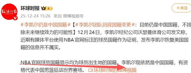 而李凱爾是歸化球員,此次爭(zhēng)議的核心是NBA官網(wǎng)的國(guó)籍標(biāo)注變動(dòng),并非實(shí)質(zhì)國(guó)籍變更,且已有經(jīng)紀(jì)公司明確澄清“恢復(fù)美國(guó)國(guó)籍不實(shí)”。