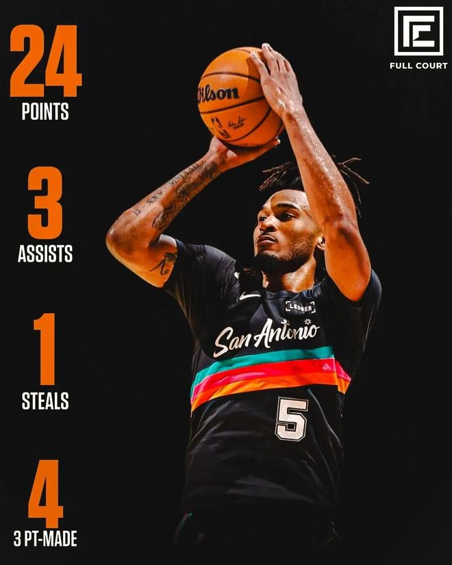 如此關鍵的一場勝利,馬刺的當家后衛(wèi)之一,卡斯爾打出了相當精彩的表現(xiàn):全場只打了28分鐘,投籃12中7,三分6中4,罰球6中6,拿下24分3助攻1搶斷。