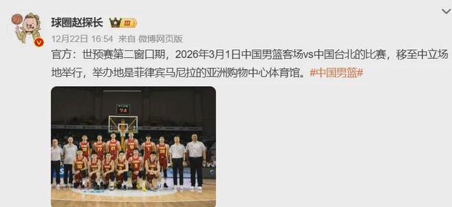 值得一提的是,明年3月1日中國男籃VS中國臺(tái)北隊(duì)的比賽,將移至中立場(chǎng)地舉辦,地點(diǎn)位于菲律賓馬尼拉的亞洲購物中心體育館。
