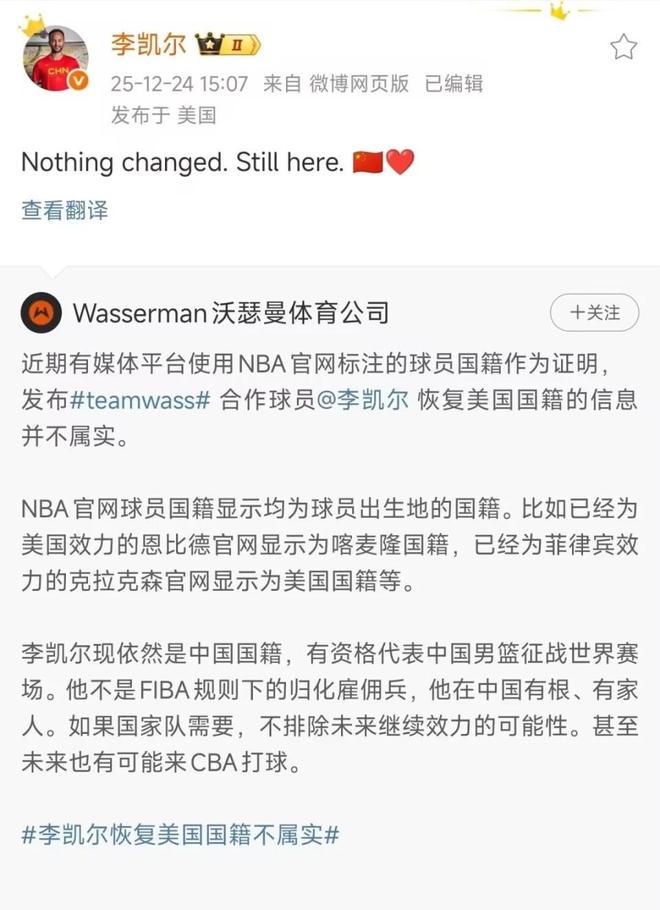 李凱爾及其經(jīng)紀(jì)公司沃瑟曼體育公司于2025年12月24日發(fā)布聲明:否認(rèn)李凱爾恢復(fù)美國(guó)國(guó)籍的傳聞。