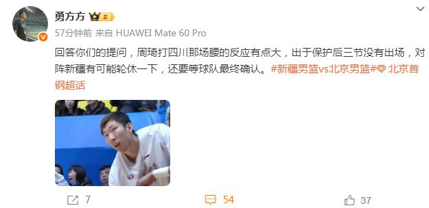 對此,媒體人勇方方如今表示:“回答你們的提問,周琦打四川那場腰的反應(yīng)有點大,出于保護后三節(jié)沒有出場,對陣新疆有可能輪休一下,還要等球隊最終確認(rèn)。”