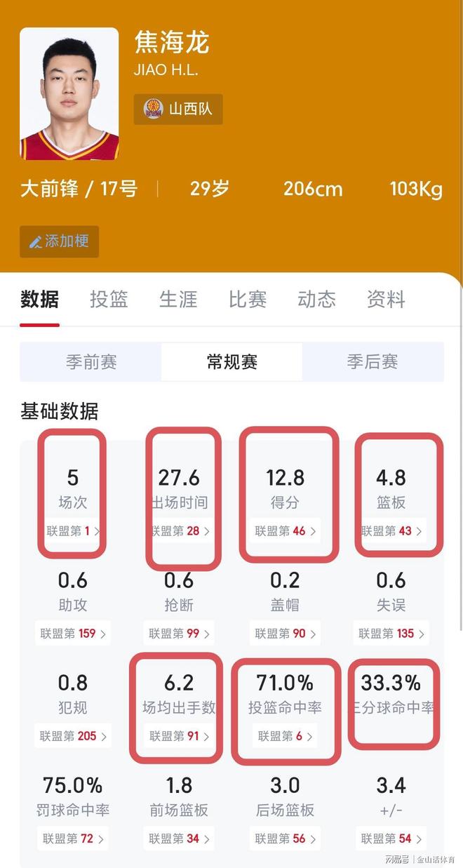 作為一名大前鋒,焦海龍能里能外,既能在籃下背打,也能面筐跳投,還能拉到外線投三分。更關(guān)鍵的是,焦海隊(duì)在場上可以自創(chuàng)進(jìn)攻機(jī)會(huì),不占用球權(quán)。本賽季,焦海龍?jiān)趫鼍?7分鐘上場時(shí)間里,為球隊(duì)貢獻(xiàn)12.8分4.8籃板,是球隊(duì)包括外援在內(nèi)的第4得分點(diǎn)。盡管他場均可以拿到近13分,但他場場只出手6.2次,進(jìn)攻效率非常高。
