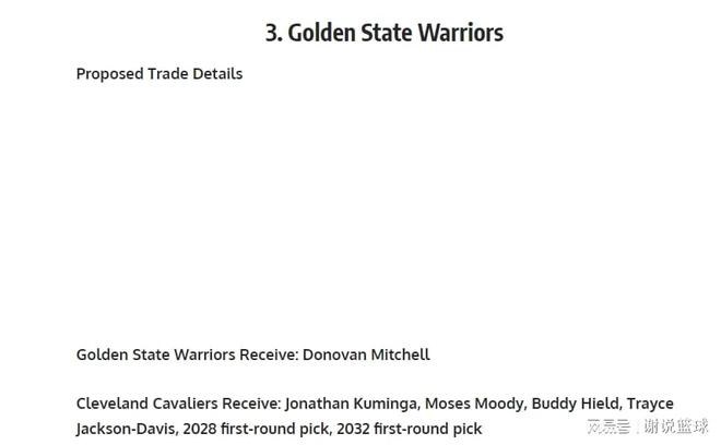 但假如是這個結(jié)果,球迷肯定會很不甘心,媒體FW就支招勇士,交易來雙能衛(wèi)多諾萬-米切爾,顯然他實力超群,又處于生涯巔峰期。方案里勇士四名球員成籌碼,包括庫明加、穆迪、希爾德和杰克遜-戴維斯,此外還要送出兩個未來首輪簽。