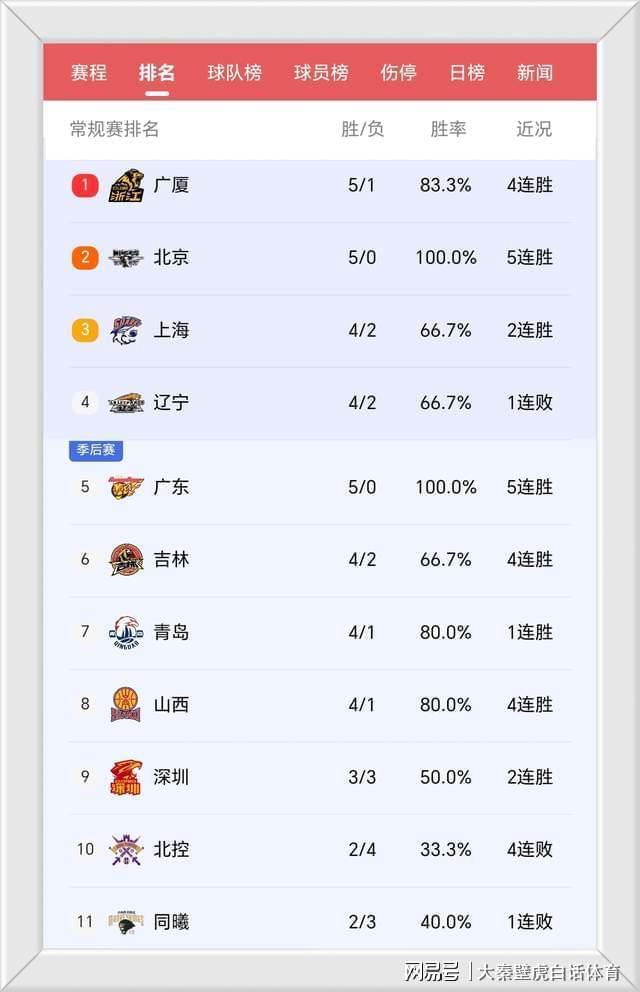 由于先賽一輪,衛(wèi)冕冠軍廣廈隊(duì)以5勝1負(fù)沖上榜首,北京男籃和廣東男籃均5勝0負(fù),但前者依舊高居排名第2,而后者則落后上海和遼寧,只能排在第5位。
