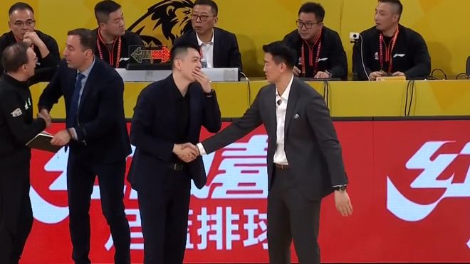 此時鏡頭給到了雙方主教練,楊鳴提前走過去和王博握手,接下來有意思的地方來了,楊鳴握住王博的手久久沒有撒開,捂著臉和王博說了一些悄悄話,兩人聊了有一小會,有說有笑的楊鳴還偷偷扯了一下王博的西裝,似乎這場比賽的慘敗并沒有影響到楊鳴的心情,這有點反常。
