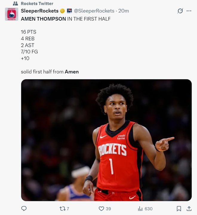 這場比賽烏度卡變陣了,他讓此前攻防兩端發(fā)揮積極的伊森先發(fā),火箭再度進入先發(fā)五大,阿門回到一號位,沒想到開場阿門的攻防都非常出色,他5中4拿到9分3籃板2助攻1搶斷,他盯防下的東契奇2中1+4失誤非常拉胯。
