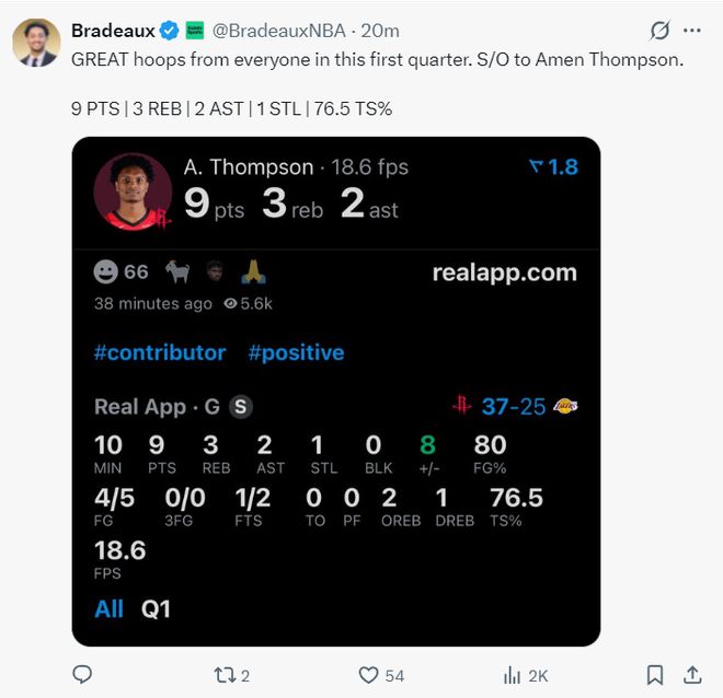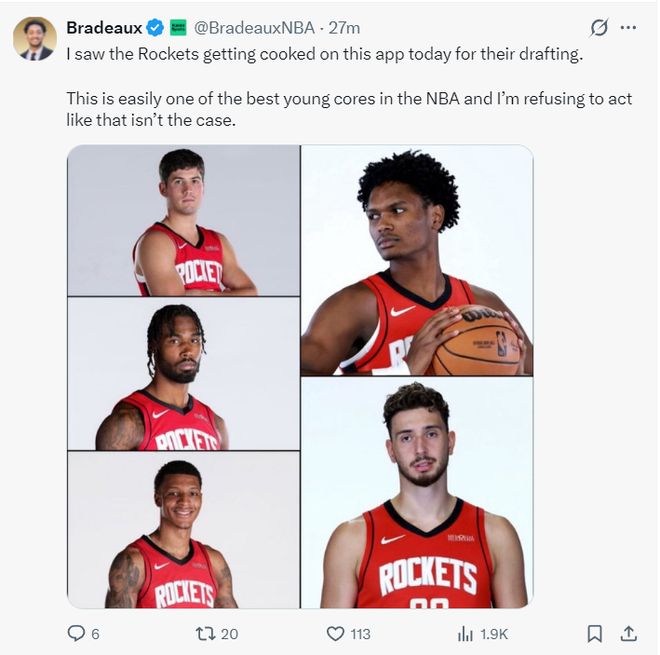 火箭記者Bradeaux:賽前我在社媒上看到有人說火箭因為選秀的年輕球員遭遇連敗。我想說的是,這肯定是聯(lián)盟最出色的年輕團隊之一。
