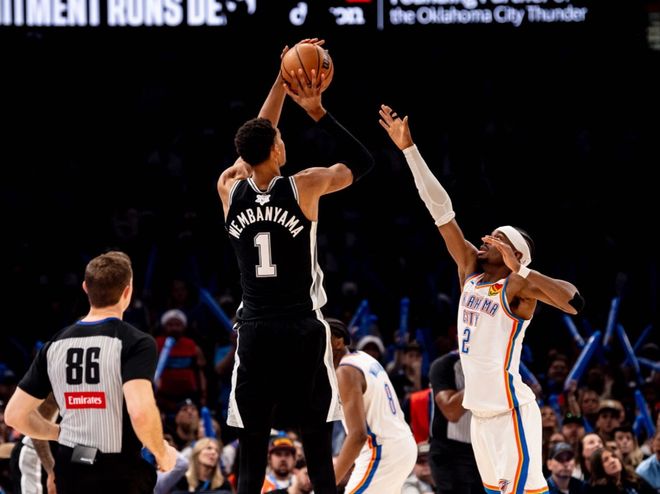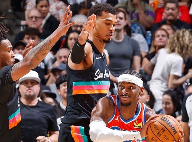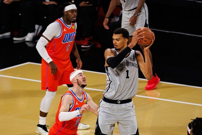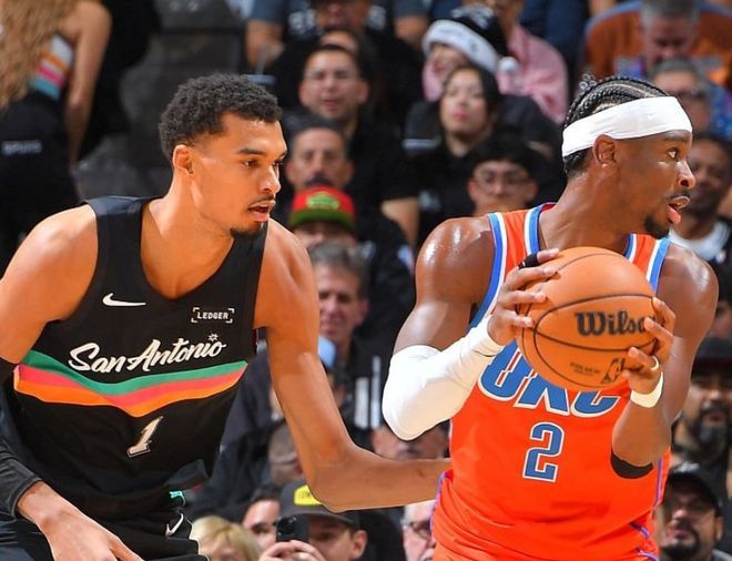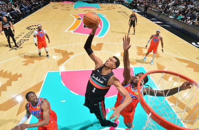這個(gè)最華麗的泡沫被戳破的過(guò)程,要分兩個(gè)部分說(shuō)。第一部分:馬刺三場(chǎng)勝利,贏法各不相同。第一場(chǎng)文班亞馬統(tǒng)治第四節(jié);第二場(chǎng)奇兵凱爾登約翰遜站出來(lái),在文班亞馬和??怂股磉叢粩喟l(fā)炮;第三場(chǎng)則是馬刺后場(chǎng)三杰:??怂?哈珀+卡斯?fàn)栞喠鞅l(fā),雷霆補(bǔ)了東墻漏西墻!馬刺對(duì)待雷霆進(jìn)攻策略很簡(jiǎn)單,第一是減少自己失誤,不讓雷霆抓反擊機(jī)會(huì)。而陣地戰(zhàn)中,馬刺就放卡魯索和多特兩個(gè)空間累贅點(diǎn),其他人突不進(jìn)去,這兩人又投不進(jìn)去,陣地戰(zhàn)雷霆啞火,只剩下罰球維持局面。而文班亞馬的屬性價(jià)值,在進(jìn)攻端也很重要。