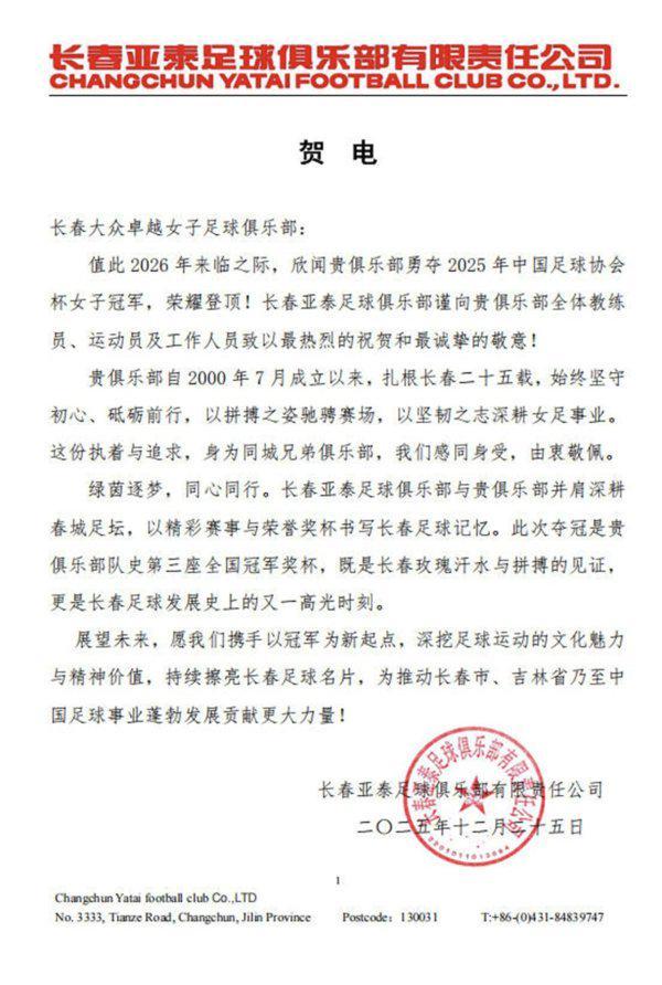 無(wú)獨(dú)有偶,長(zhǎng)春大眾卓越女足的同城“兄弟”亞泰足球俱樂(lè)部也在其奪冠后,發(fā)來(lái)賀電。