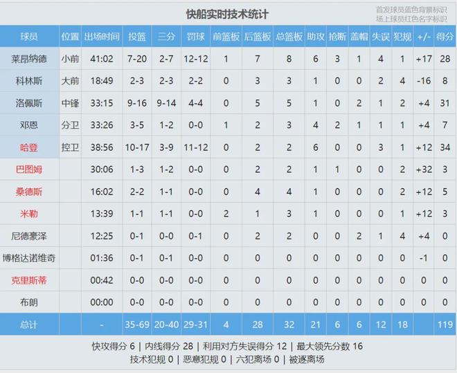 倫納德此役20投7中,三分7中2,罰球12中12,拿到28分8籃板6助攻3搶斷1蓋帽??齑B勝期間,小卡場均轟下33.7分9.3籃板4.7助攻2搶斷1蓋帽。哈登今天17投10中,三分9中3,罰球12中11,砍下34分2籃板6助攻。