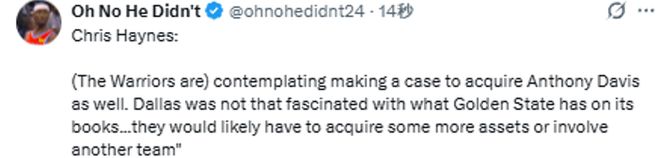 “我今天還挖到了一個(gè)很有意思的消息。上周我就跟你說(shuō)過(guò),勇士隊(duì)一直在尋找內(nèi)線球員——能沖筐、護(hù)框,還能完成空接的大個(gè)子?,F(xiàn)在有消息稱,他們也在考慮推進(jìn)交易,引進(jìn)安東尼-戴維斯。”