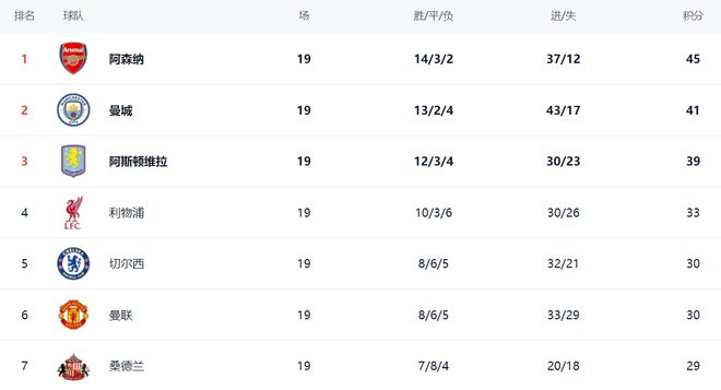 在積分榜上,阿森納以45分排名榜首,戰(zhàn)績是14勝3平2負。曼城丟掉2分,總積分是41分,落后阿森納4分。曼城爭冠難度一下子變大了。阿斯頓維拉次輪輸給阿森納,依然是39分,排名第3,在爭冠集團中有點掉隊。利物浦33分排名第4。第5的是切爾西,拿到30分。曼聯(lián)也是30分,排名第6。桑德蘭這匹黑馬以29分排名第7。熱刺和紐卡斯?fàn)柭?lián)都是26分,排名第12和第13。