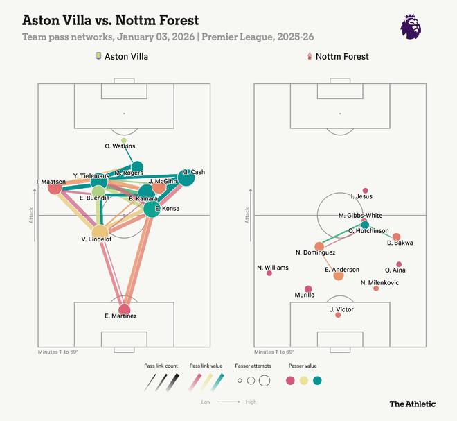 本場比賽的傳球網(wǎng)絡圖進一步凸顯了這種持續(xù)的控球流轉(zhuǎn)。維拉經(jīng)常將右路作為推進進攻的主要方向。隨著右后衛(wèi)馬蒂-卡什解禁復出,球隊42%的進攻三區(qū)觸球來自球場右路三分之一區(qū)域——這是他們本賽季英超第二高的比例。