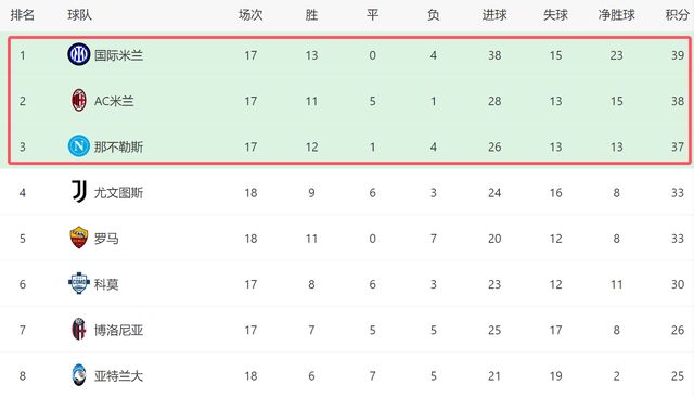 新年首戰(zhàn),國米終于拿到了3分,這也是本賽季國米拿到的第13場勝利。本場過后,國米前18輪13勝4負(少賽1輪),至今還沒有平局。截至目前,國米以39分排名第一,AC米蘭和那不勒斯位居第二和第三名,榜首3支球隊的差距只有2分,爭冠形勢依然激烈。