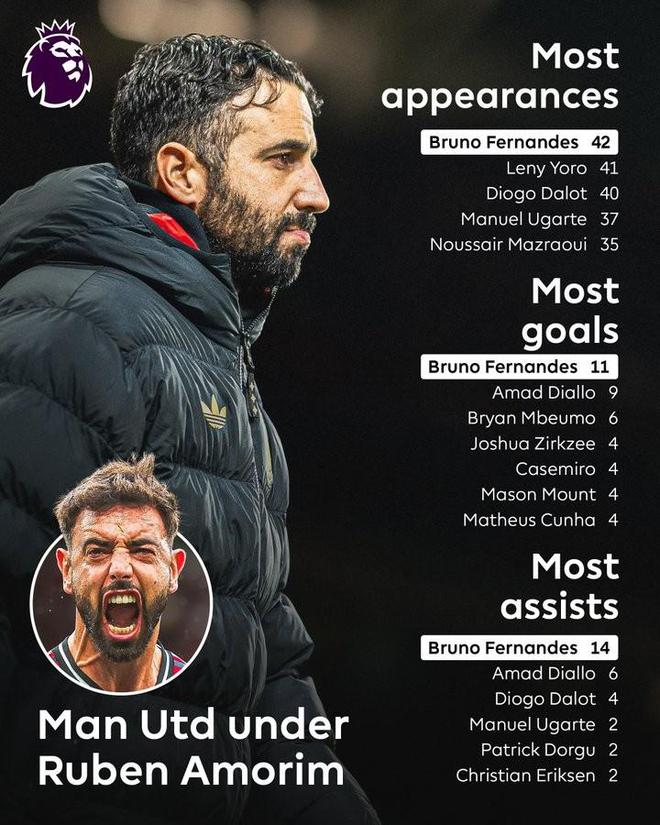 阿莫林執(zhí)教期間,B費(fèi)是曼聯(lián)英超出場(chǎng)、進(jìn)球、助攻最多的球員