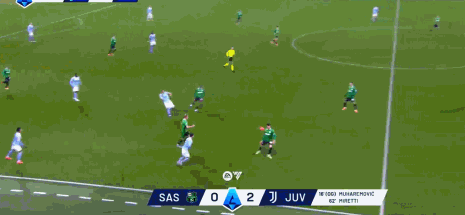 第61分鐘,尤文右路反擊,連續(xù)的傳遞,戴維策應往中路一撩,米雷蒂后排跟進拿球高速推進,甩開回防球員突入禁區(qū)獲得半單刀良機,米雷蒂調整好腳步右腳大力推射,皮球應聲入網(wǎng),尤文2:0領先。僅僅過了1分鐘,2球落后的薩索洛還送上大禮,伊澤斯回傳像是“助攻”一般,戴維高速插上斷球突入禁區(qū)獲得單刀良機,面對出擊的穆里奇,戴維一個橫向變向輕松過掉,隨后打空門得手,尤文1分鐘連進2球,3:0鎖定勝局。