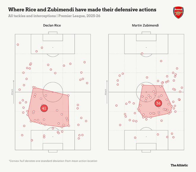 在無球狀態(tài)下,蘇比門迪在阿森納隊內(nèi)中場三區(qū)的場均搶斷次數(shù)(0.94次)排名第一,而賴斯排名第六(0.63次)。盡管造成這一情況的部分原因是后者的防守動作覆蓋區(qū)域更大,如下方圖表所示。