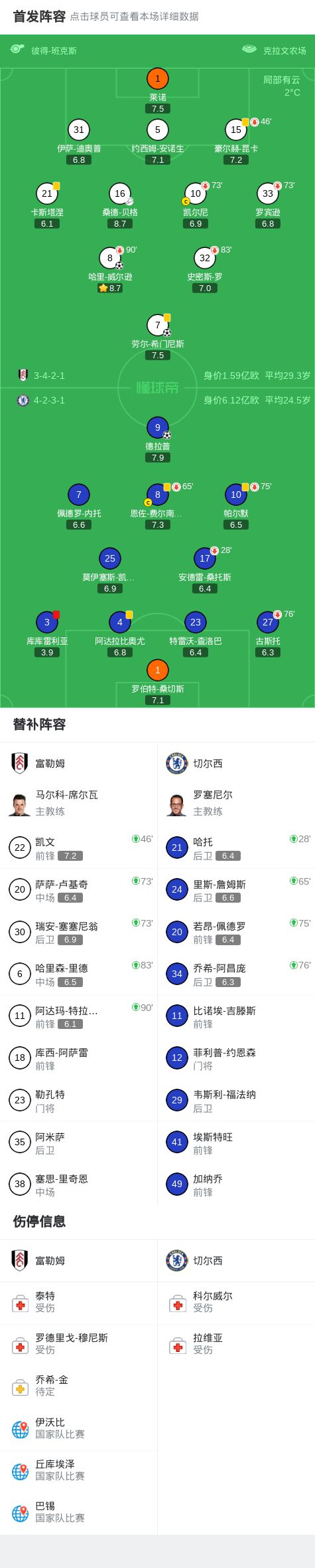 北京時間1月8日英格蘭足球頂級聯(lián)賽 聯(lián)賽 第21輪,富勒姆主場對陣切爾西。上半場庫庫雷利亞背后拉人破壞單刀機會,裁判直紅將其罰下,勞爾-希門尼斯越位在先,哈里-威爾遜進球被吹無效。下半場桑德-貝格助攻勞爾-希門尼斯頭球破門打破場上僵局,隨后德拉普門前后點端射破門完成個人聯(lián)賽首球,比賽尾聲哈里-威爾遜左勾右打成功破門幫助球隊取勝。全場戰(zhàn)罷,最終比分富勒姆 2-1 切爾西。