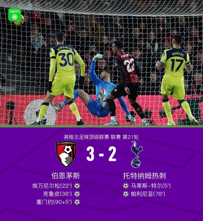 北京時(shí)間1月8日英格蘭足球頂級(jí)聯(lián)賽 聯(lián)賽 第21輪,伯恩茅斯主場(chǎng)對(duì)陣托特納姆熱刺。上半場(chǎng)特爾內(nèi)切低射遠(yuǎn)角破門,之后塔韋尼耶傳中,埃萬(wàn)尼爾松頭球破門扳平比分,之后塞內(nèi)西助攻克魯皮破門反超比分。下半場(chǎng)帕利尼亞精彩倒鉤破門扳平比分,補(bǔ)時(shí)階段塞門約世界波絕殺。最終熱刺2-3不敵伯恩茅斯。