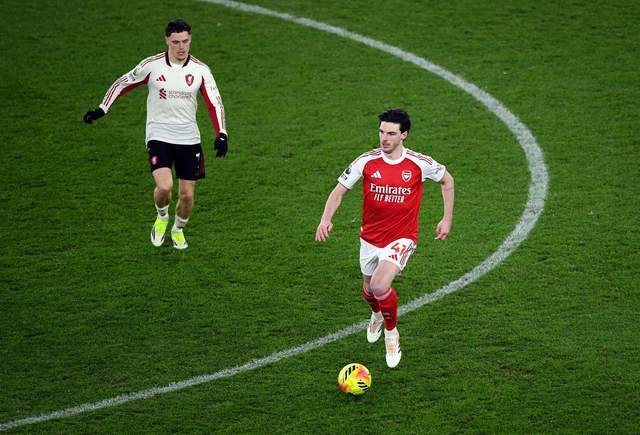 由于曼城本輪率先出戰(zhàn)并且失分,阿森納只要獲勝就能繼續(xù)擴大領先優(yōu)勢,本場比賽槍手沿用433陣型,哲凱賴什、特羅薩德和薩卡搭檔三叉戟,賴斯、蘇維門迪和厄德高坐鎮(zhèn)中場,薩利巴和加布里埃爾統(tǒng)領后防線。