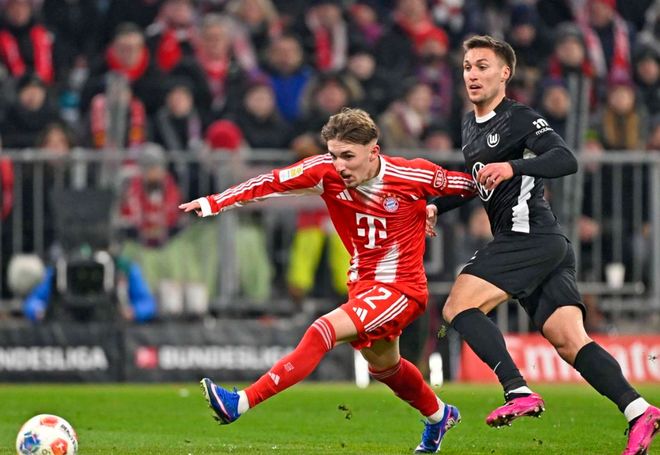 第30分鐘,拜仁再次取得進(jìn)球。奧利塞在右側(cè)起球傳中,迪亞斯后點(diǎn)頭球攻門,球進(jìn)了!9分鐘后,卡爾獲得絕佳單刀機(jī)會(huì),但是,他的射門踢得有點(diǎn)正。門將把球撲出。迪亞斯補(bǔ)射踢偏了。隨后,斯萬貝里犯規(guī),被出示黃牌。這也是上半場(chǎng)唯一的黃牌。半場(chǎng)結(jié)束,拜仁2-1領(lǐng)先沃爾夫斯堡。