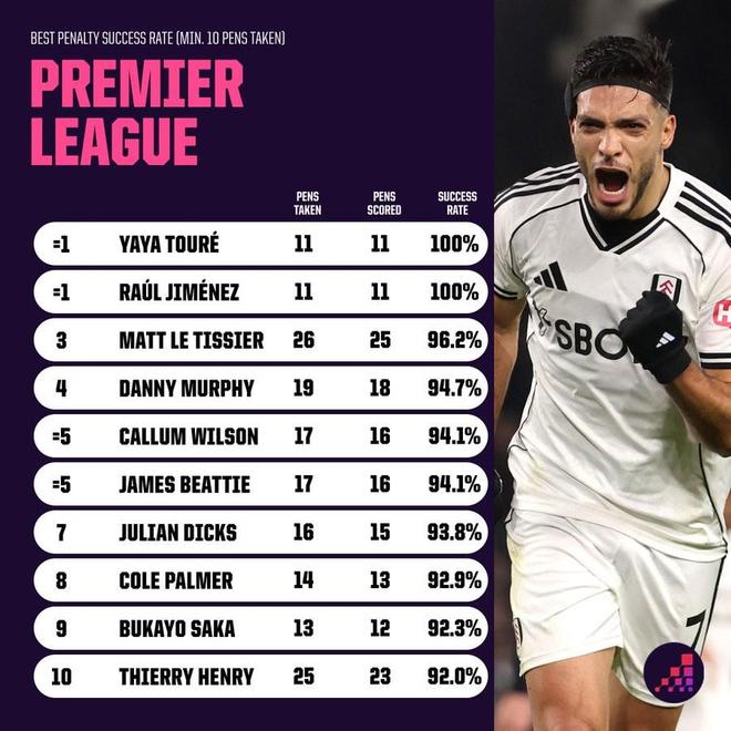 這是希門尼斯在英超聯(lián)賽中第11次主罰點(diǎn)球,他依然保持著11罰11中的驚人紀(jì)錄。