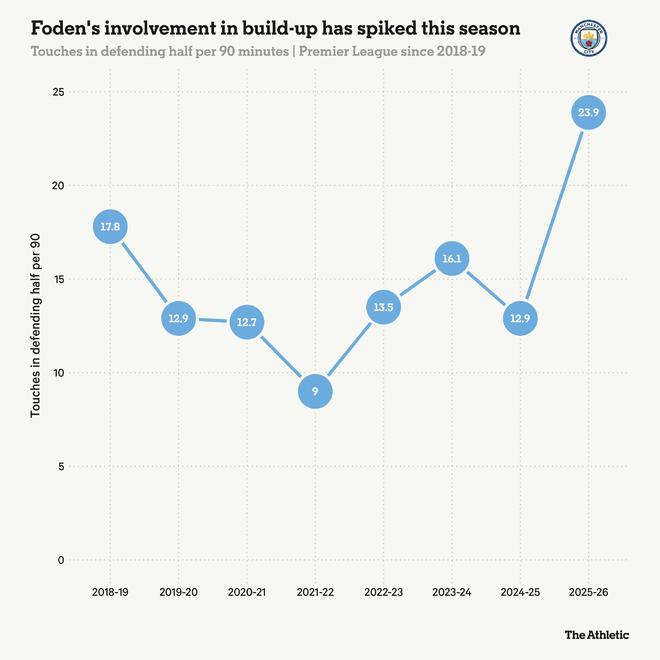 英格蘭隊(duì)主教練托馬斯-圖赫爾已確信他屬于中路,在那里,他對(duì)比賽的影響力比以往任何時(shí)候都大。羅德里本賽季長(zhǎng)期缺陣可能是一個(gè)因素,但如下圖所示,福登回撤接應(yīng)、幫助曼城破解對(duì)手高位逼搶的次數(shù)也達(dá)到了前所未有的程度。