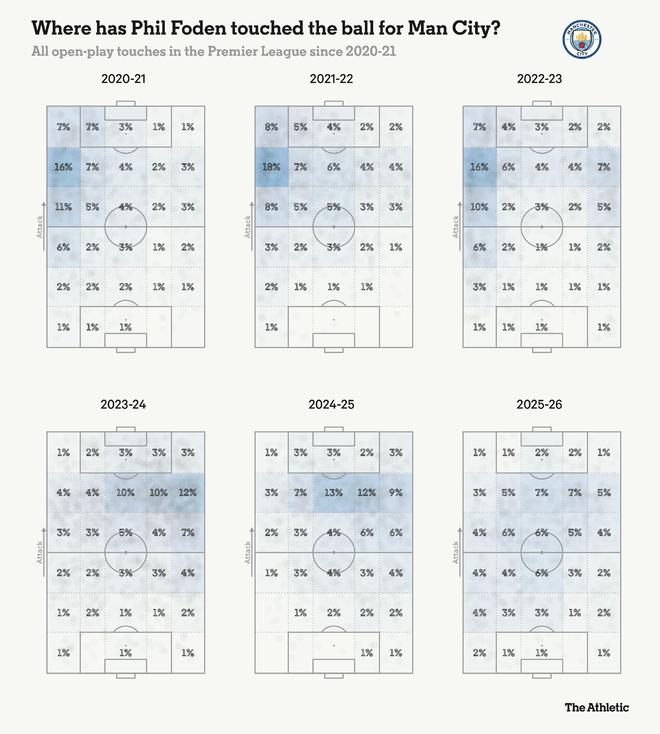 他有過(guò)幾次擔(dān)任中路的時(shí)期,但他必須等到本賽季,瓜迪奧拉才相信他已準(zhǔn)備好完全承擔(dān)這份責(zé)任。十年循序漸進(jìn)的指導(dǎo),最終促成了曼城所期望的“完全體”福登的出現(xiàn)。