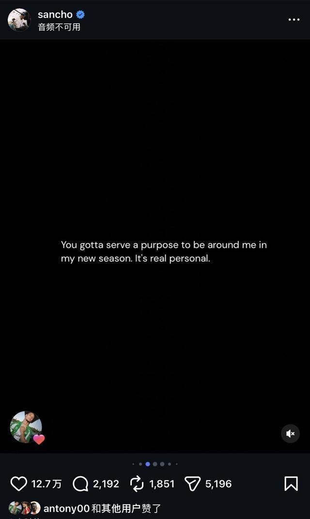 桑喬近日在社交媒體上發(fā)布了一則意味深長的動態(tài)。在從曼聯(lián)租借至阿斯頓維拉后,這名邊鋒本賽季的出場時間一直較為有限。