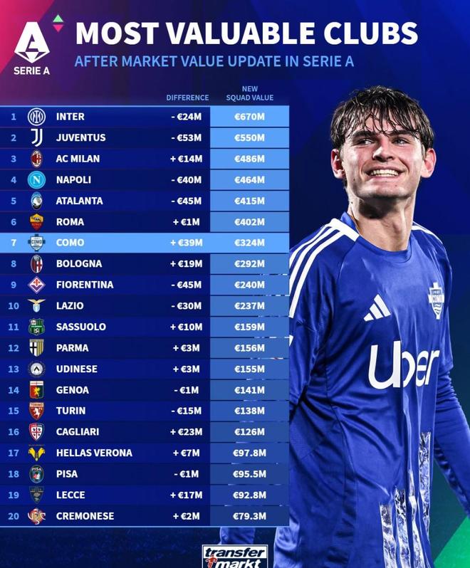 北京時(shí)間12月23日,在更新了意甲球員的身價(jià)之后,德轉(zhuǎn)列出了意甲俱樂部的總身價(jià)排名,此次更新后國際米蘭全隊(duì)的身價(jià)下跌了2400萬歐元,不過他們依然以6.7億歐元的高居第一,尤文圖斯5.5億歐元第二,AC米蘭4.86億歐元第三,那不勒斯4.64億歐元第四。