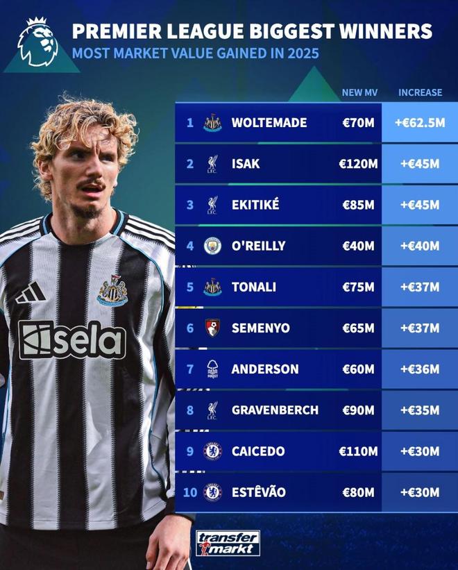 北京時(shí)間12月25日,德轉(zhuǎn)列出了英超球員中2025年漲幅最高的10名球員,今夏加盟紐卡斯?fàn)柭?lián)的沃爾特馬德過去這一年里身價(jià)暴漲6250萬歐元高居第一,伊薩克和埃基蒂克上漲4500萬歐元并列第二。