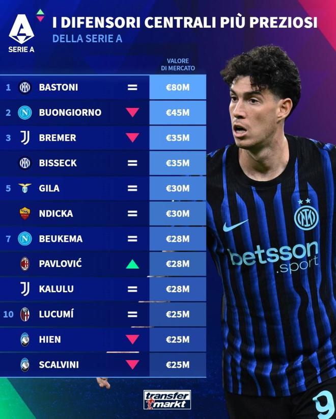 意甲中衛(wèi)身價(jià)前10:巴斯托尼8000萬(wàn)斷檔第1,早安哥4500萬(wàn)第2