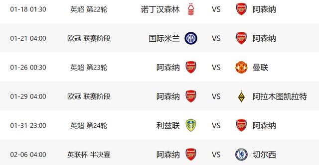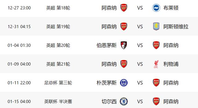 根據(jù)賽程安排,從本周末開始,到2月初,差不多41天的時間,阿森納將踢12場比賽,也就是說阿森納基本每周都在雙賽。在英超,阿森納要對陣強隊殺手布萊頓,此外還要遭遇聯(lián)賽排名前三的維拉,之后客場對陣伯恩茅斯,緊接著就要與利物浦上演強強對話。