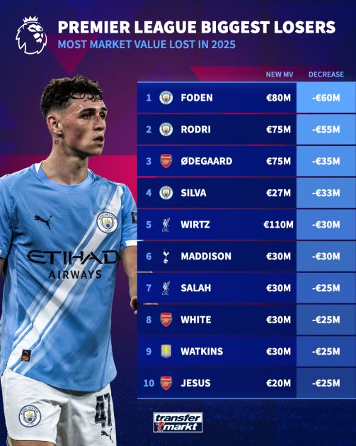 周四,《轉(zhuǎn)會(huì)市場(chǎng)》公布英超球員2025年身價(jià)跌幅榜,一年身價(jià)暴跌6000萬的福登排名榜首,羅德里、厄德高、維爾茨、薩拉赫也躋身前10位。