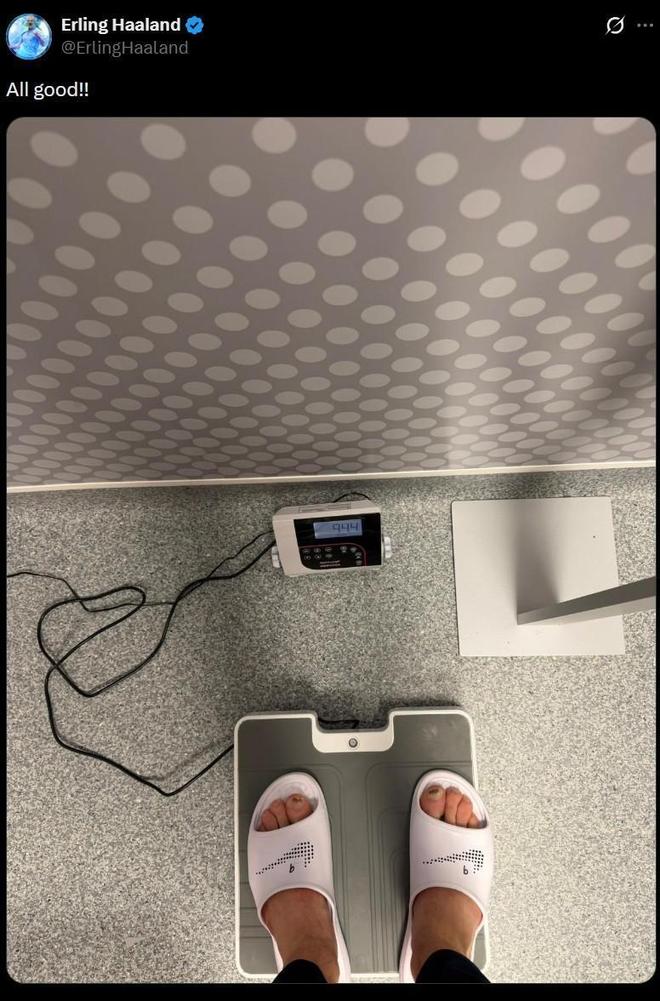 北京時間12月26日,曼城頭號球星哈蘭德更新社交媒體曬出稱重照片,并配以“一切都很好”的文字,幽默回應(yīng)了主帥瓜迪奧拉放假前對球員體重的嚴(yán)格管理要求。