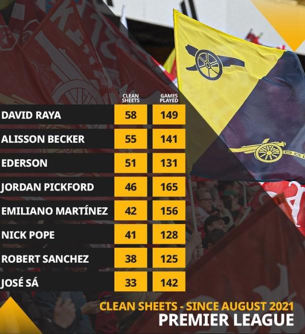 據(jù)統(tǒng)計,拉亞于2021年8月完成英超首秀,這名西班牙門將在149場聯(lián)賽中完成58次零封,這是英超門將同期最佳成績。